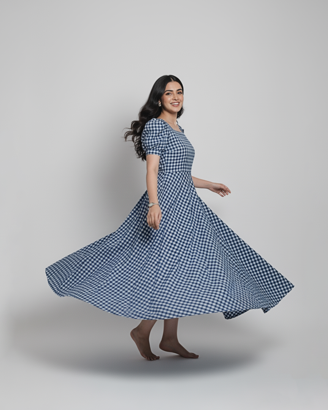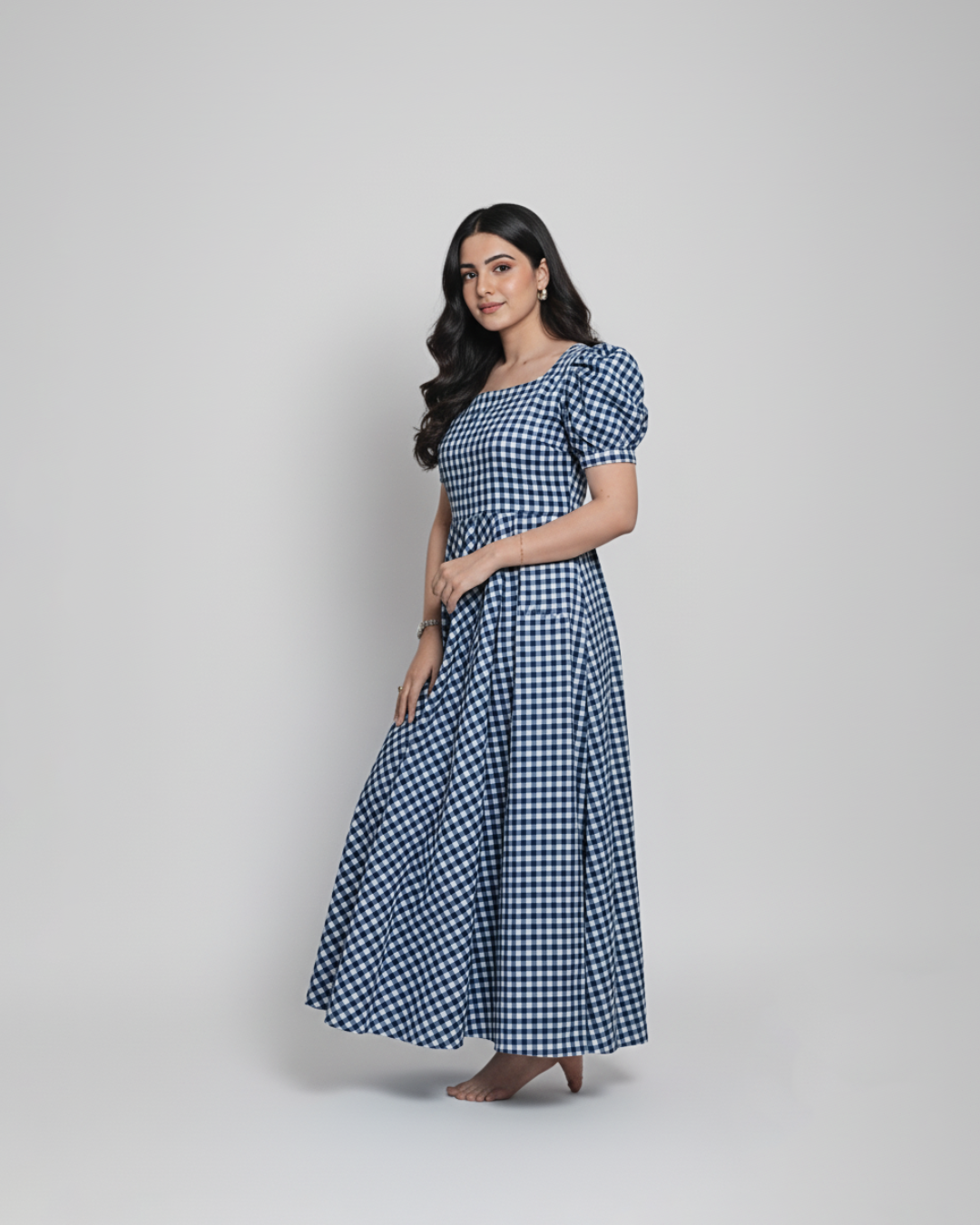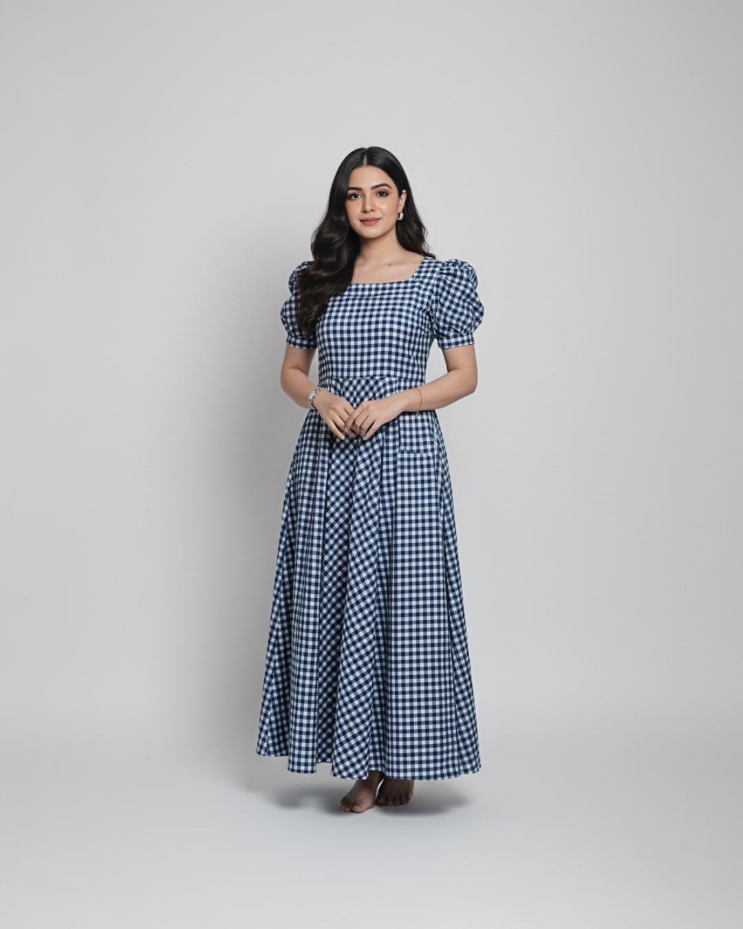 Elevate your style with our Blue Checked Puff-Sleeve Midi Dress! This charming dress features a square neckline, puffy short sleeves, and a flowy midi-length skirt made from cotton fabric. The pink and white checkered pattern adds a playful touch, making it perfect for casual outings, brunches, or summer gatherings. Pair it with sandals for a laid-back look or dress it up with accessories for a more polished vibe. Crafted with comfort and style in mind, this dress is a versatile addition to your wardrobe.
