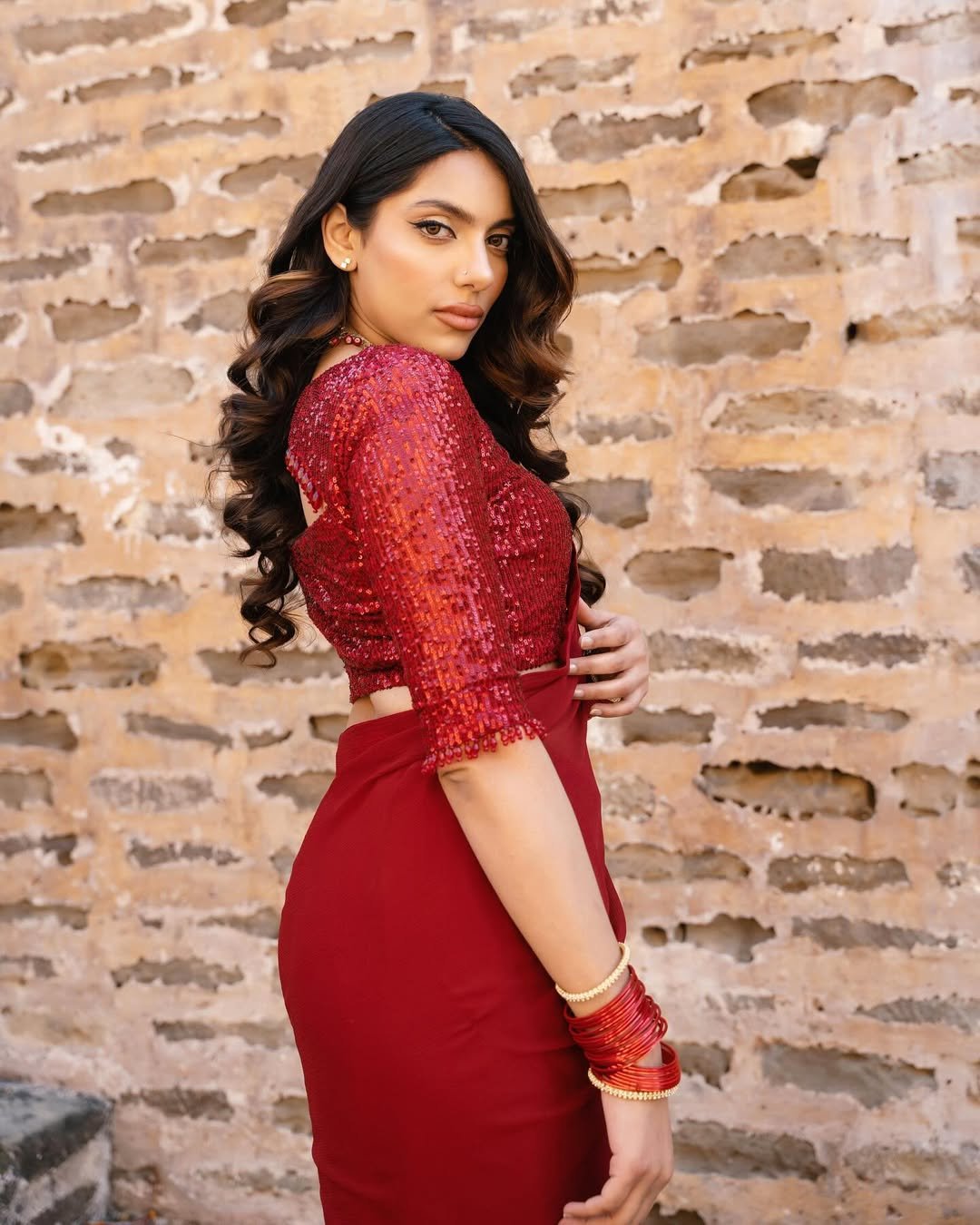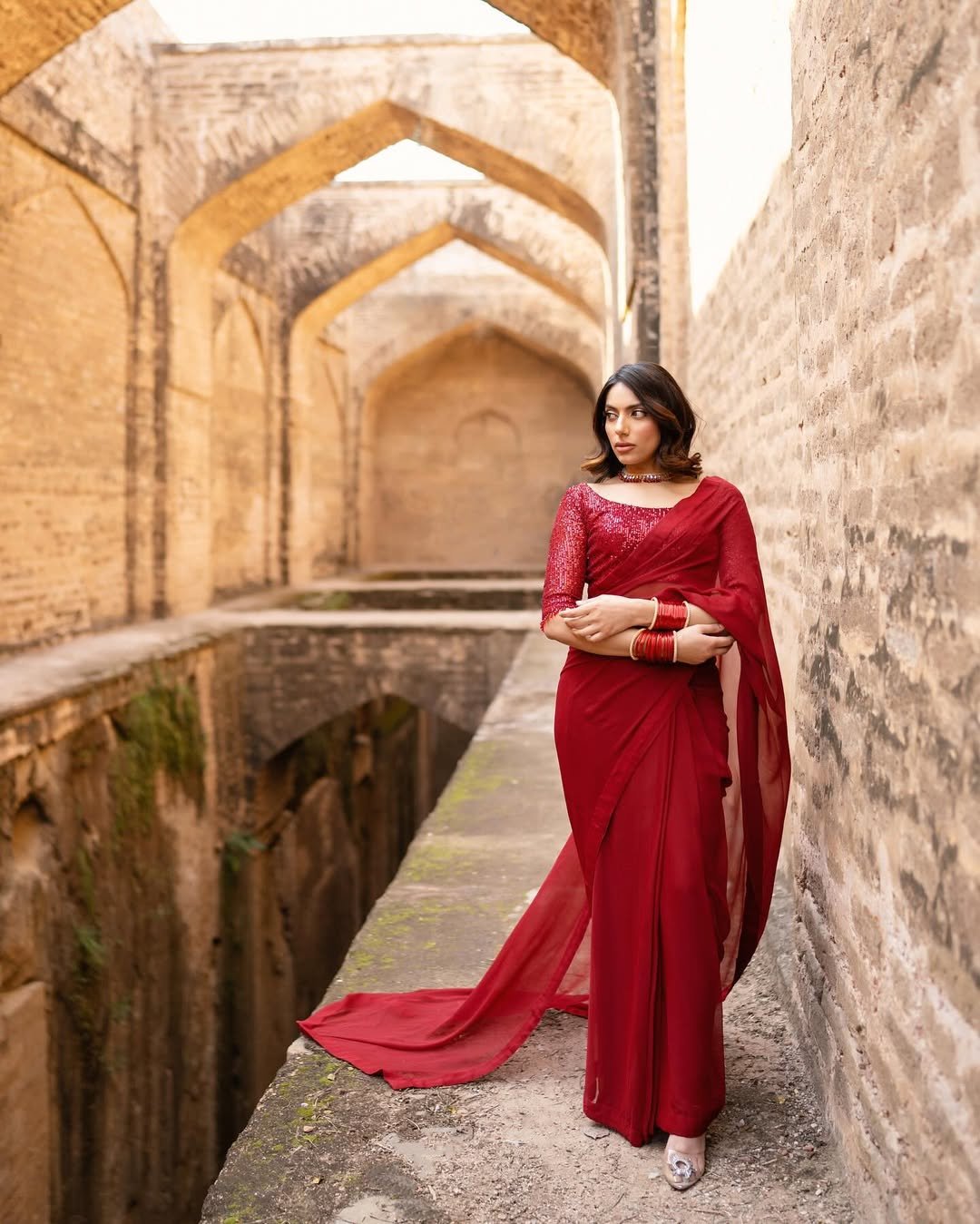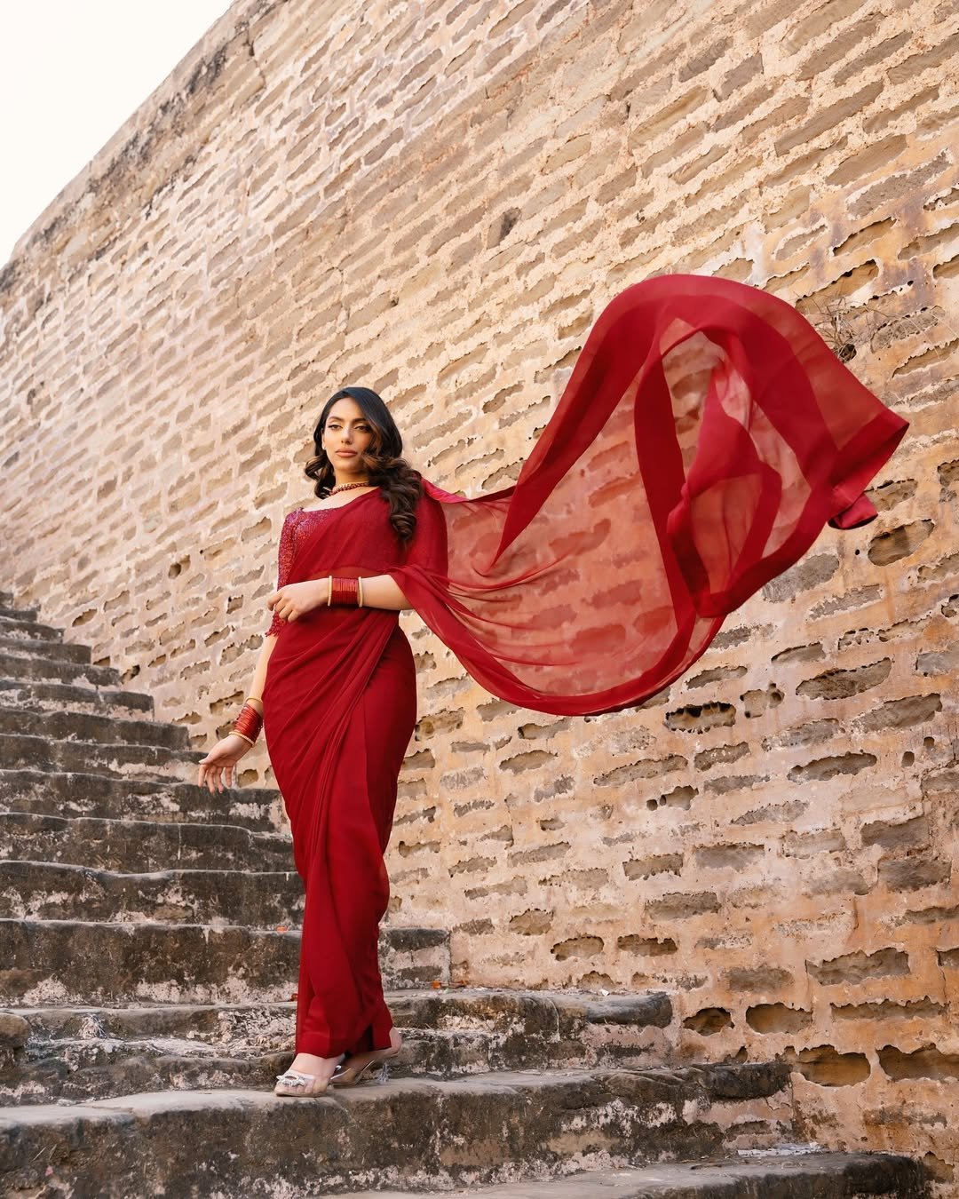 Crimson Noor Saree is an ode to classic femininity and heritage charm. Crafted in a rich crimson hue, this draped ensemble exudes confidence, grace, and celebration. The finely detailed blouse paired with a fluidly draped silhouette creates a striking balance between tradition and modern sophistication.