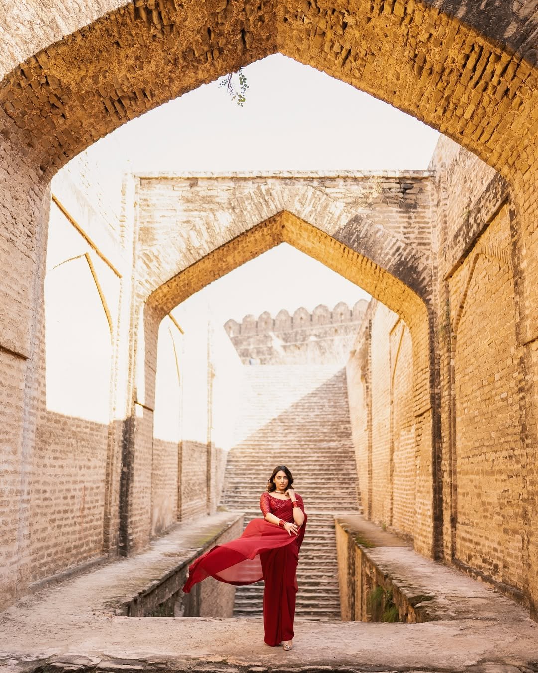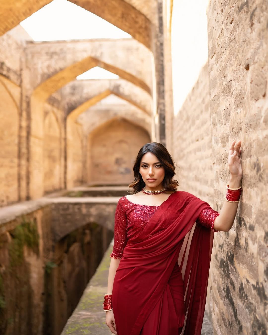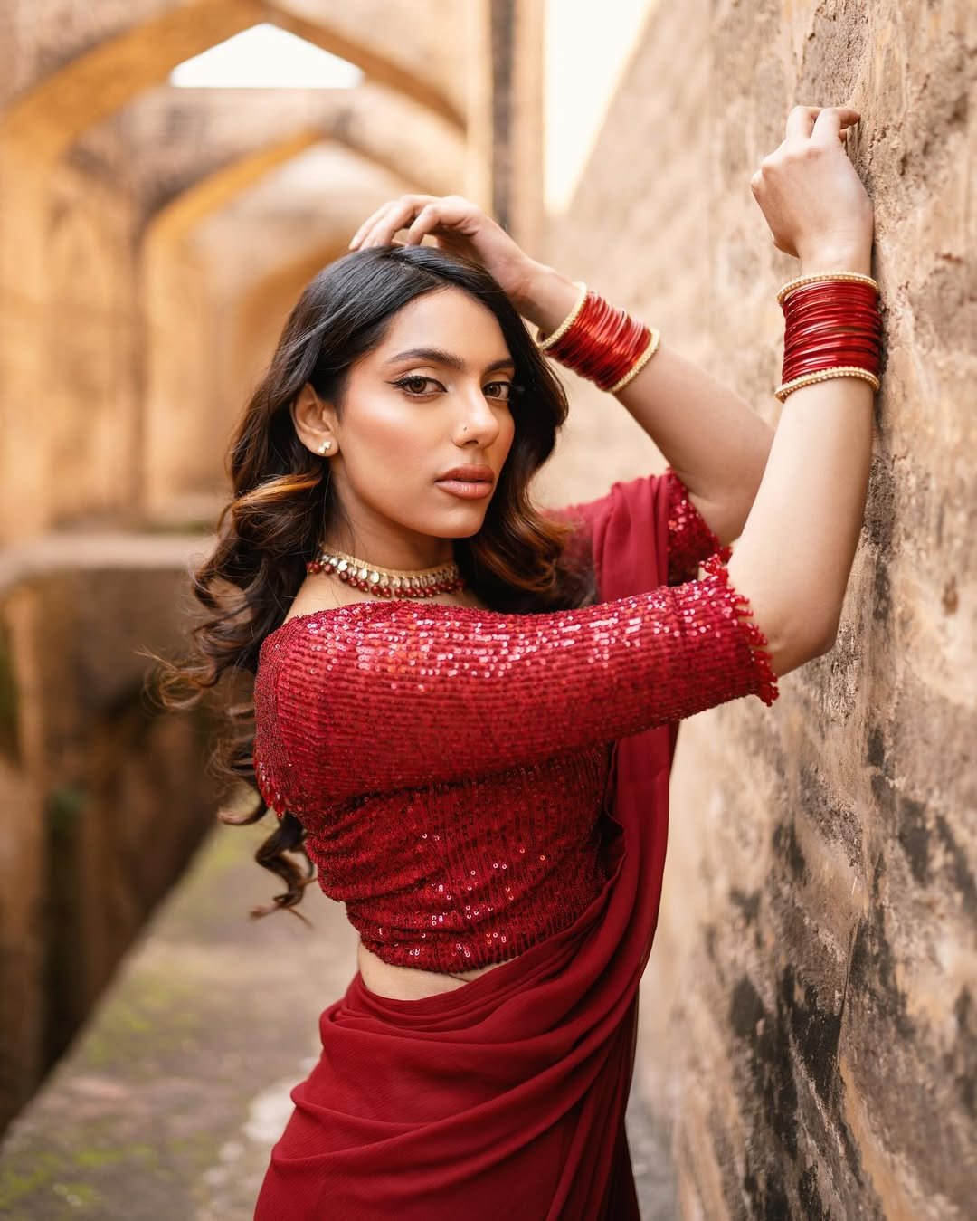 Crimson Noor Saree is an ode to classic femininity and heritage charm. Crafted in a rich crimson hue, this draped ensemble exudes confidence, grace, and celebration. The finely detailed blouse paired with a fluidly draped silhouette creates a striking balance between tradition and modern sophistication.
