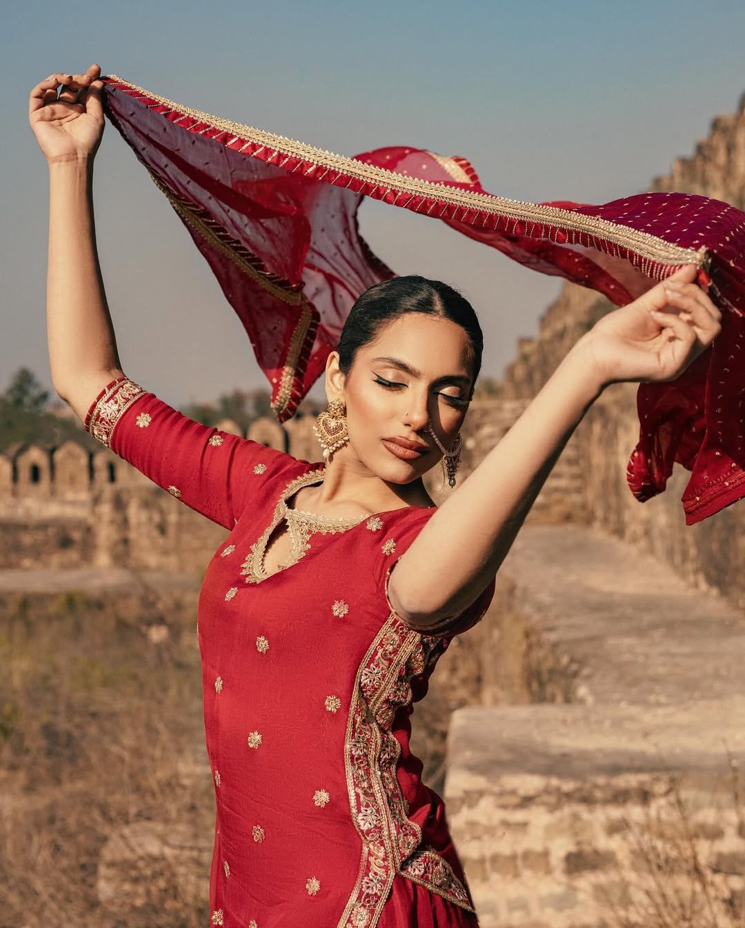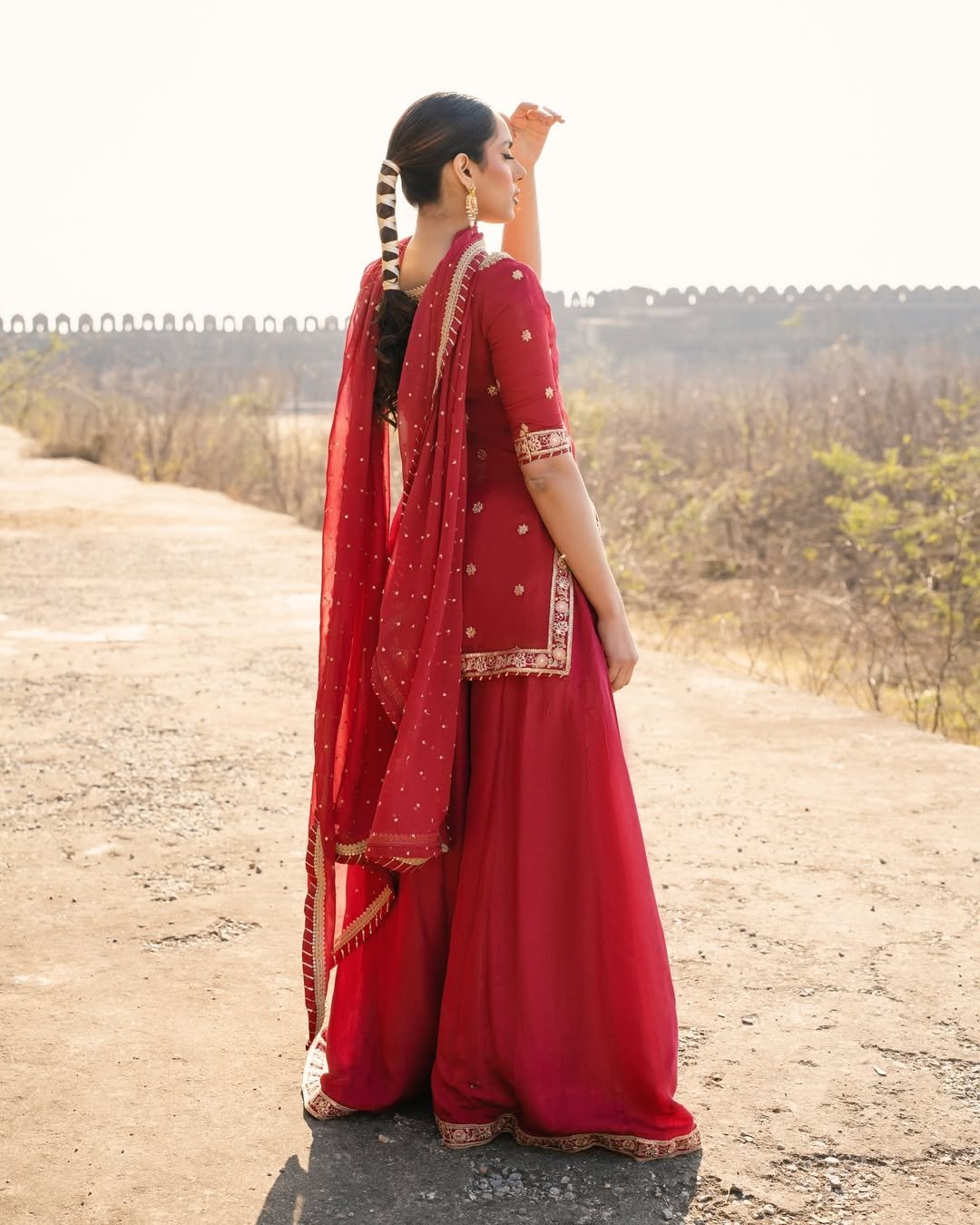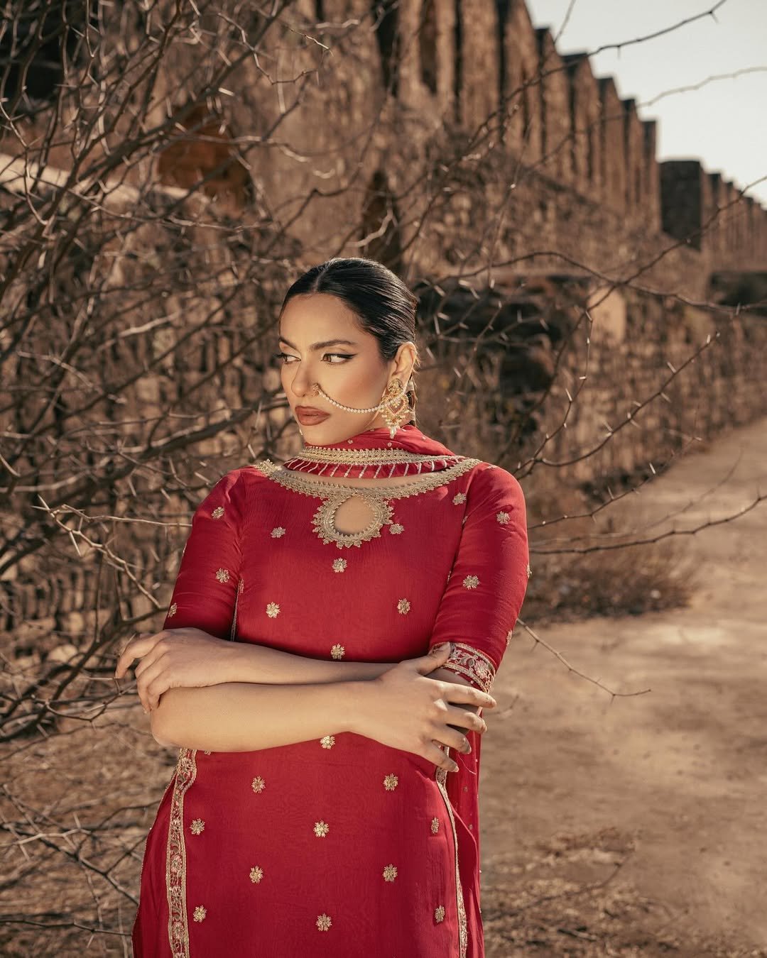 Mirha Crimson reflects timeless beauty rooted in cultural heritage. Crafted in a rich crimson red, this ensemble is designed for festive moments that call for grace and sophistication. The straight-cut shirt is adorned with delicate gold embellishments, adding a subtle festive charm without overpowering the silhouette.