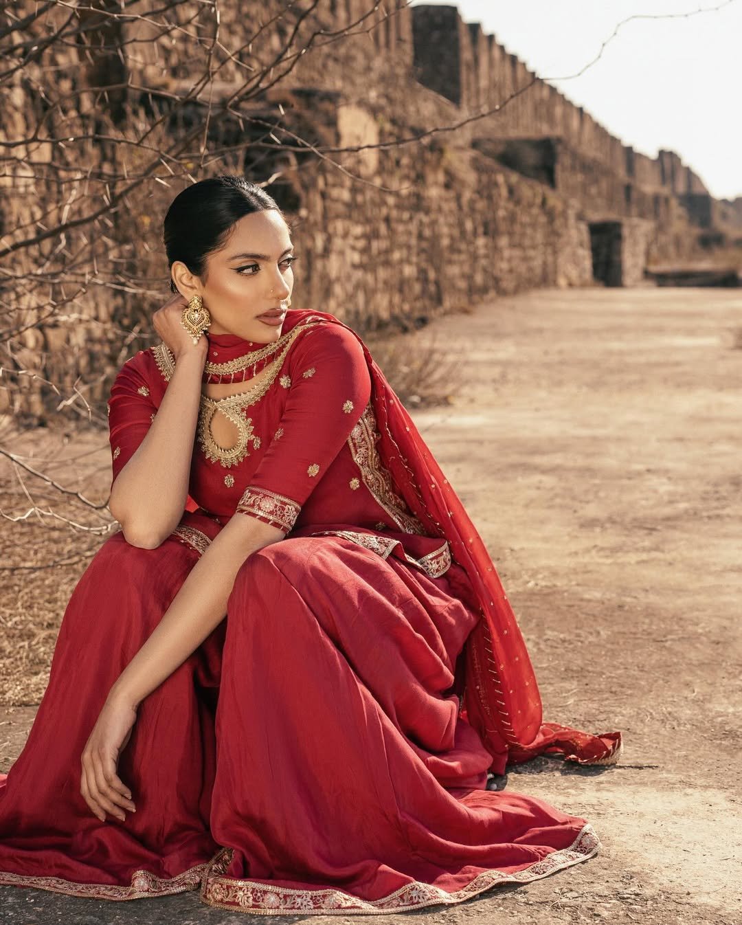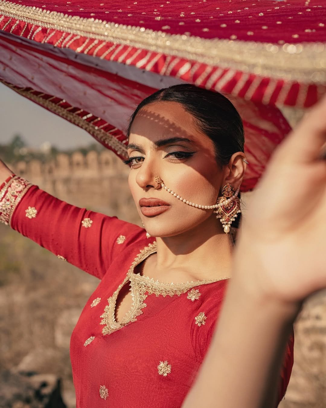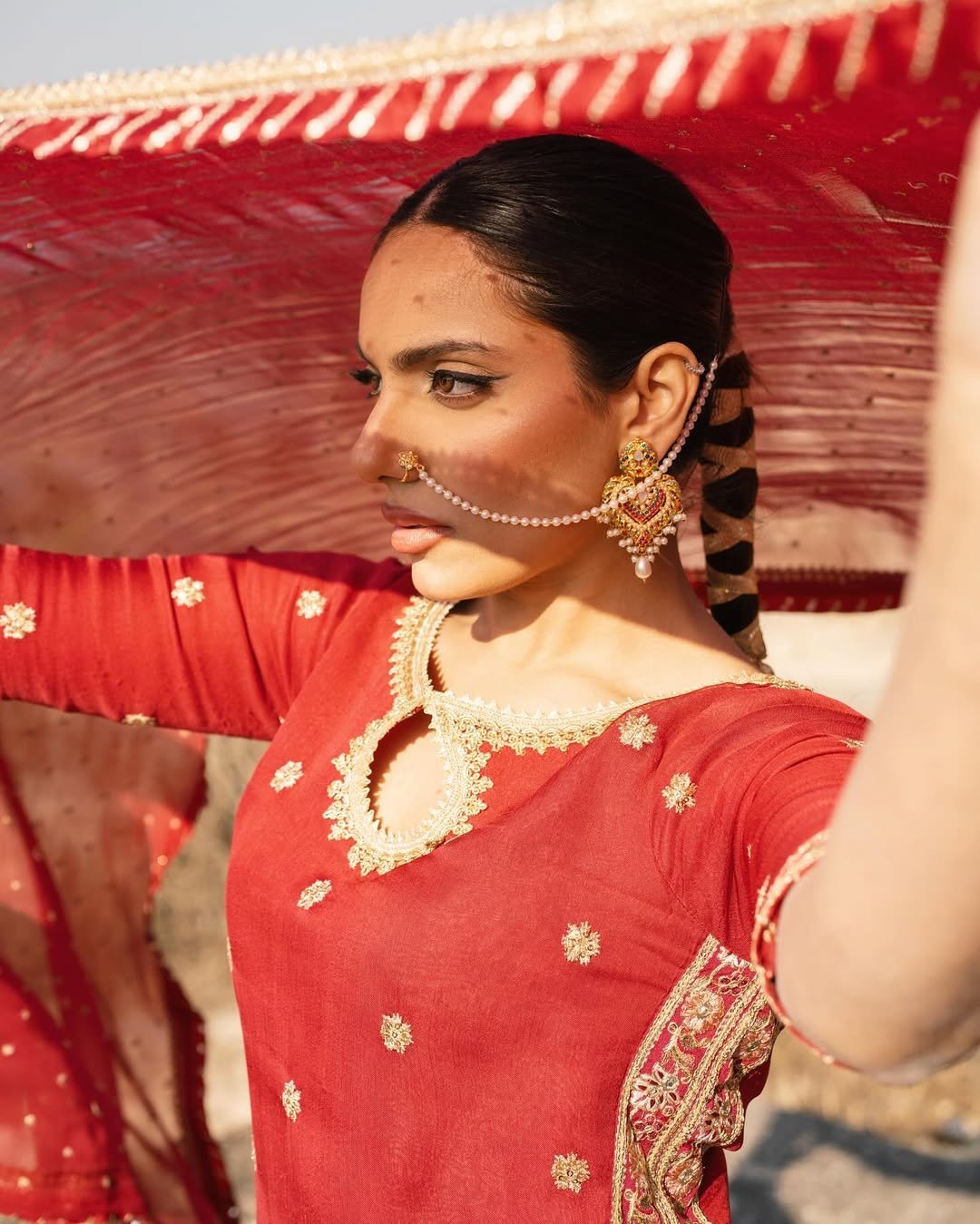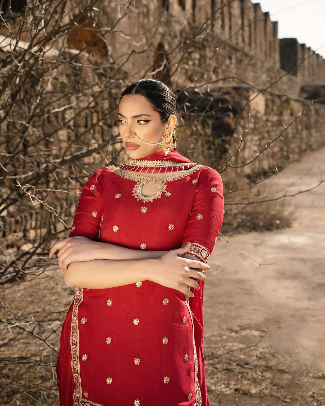 Mirha Crimson reflects timeless beauty rooted in cultural heritage. Crafted in a rich crimson red, this ensemble is designed for festive moments that call for grace and sophistication. The straight-cut shirt is adorned with delicate gold embellishments, adding a subtle festive charm without overpowering the silhouette.